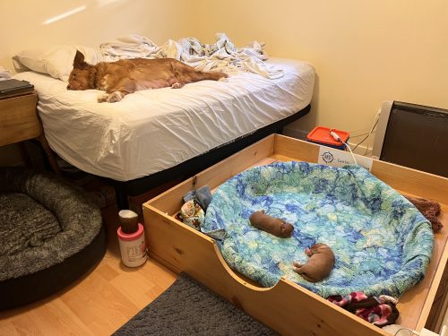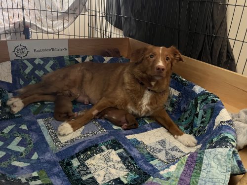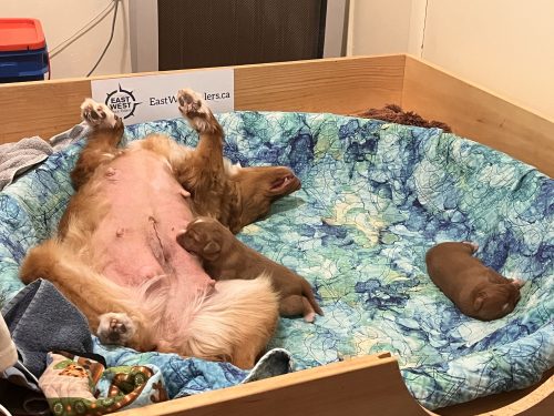 Two girls were born via c-section. This is Jigs last litter. She will fly to BC later this year to live with my son Alex in Powell River at the family property on Cranberry Lake. She’s always been Alex’s “Princess Peach” and he is excited to have his girl back.